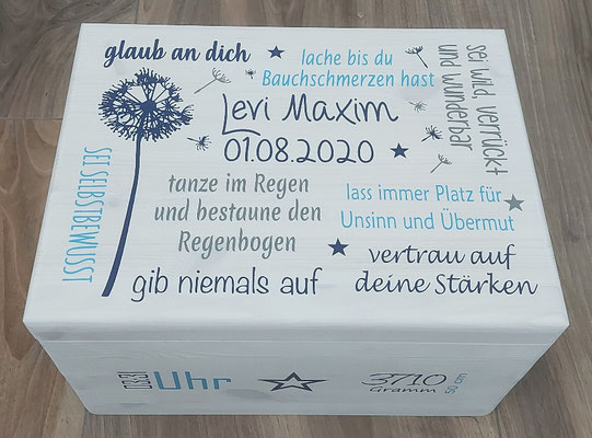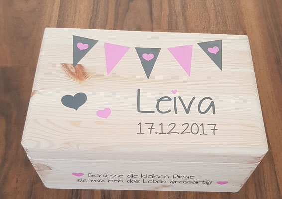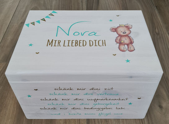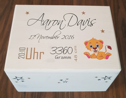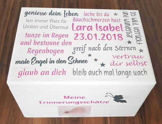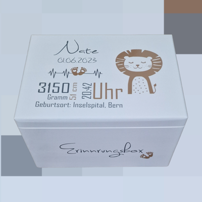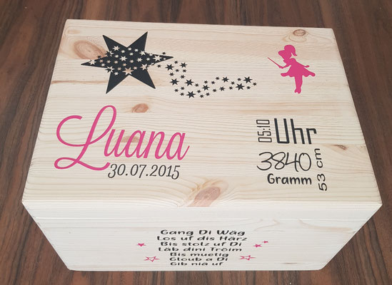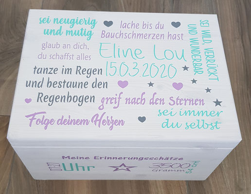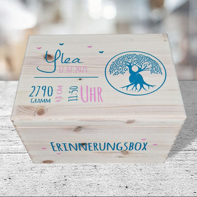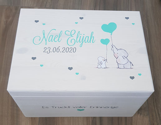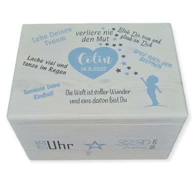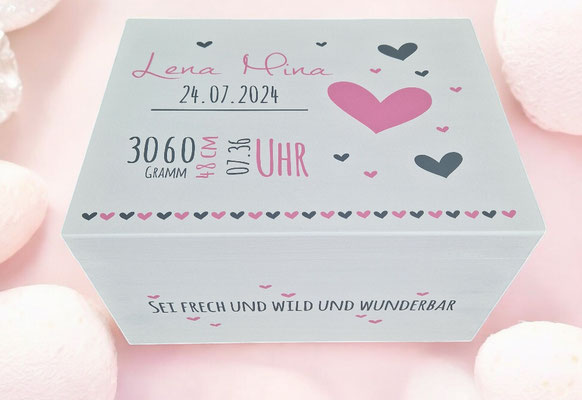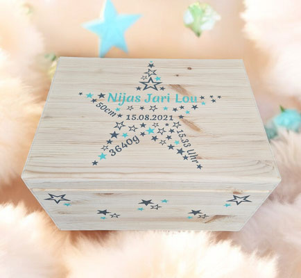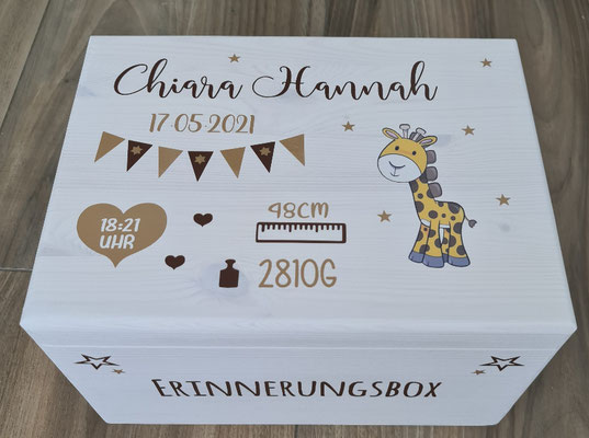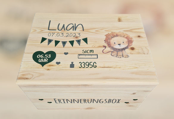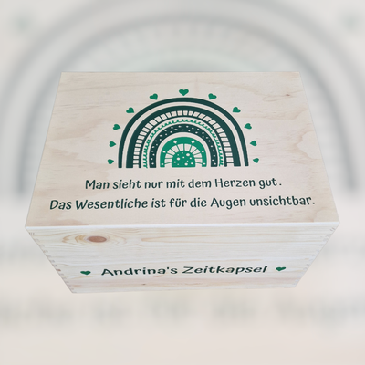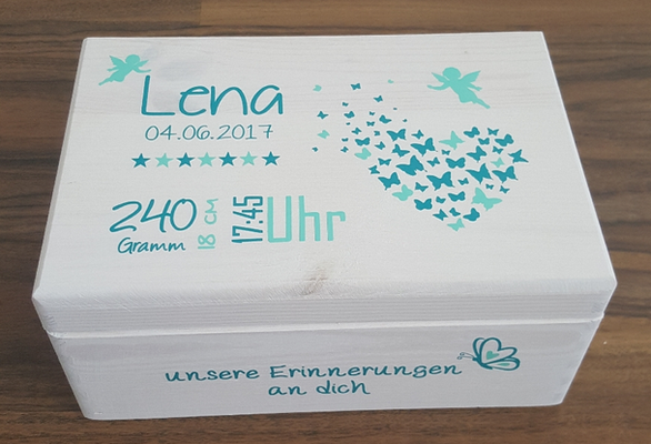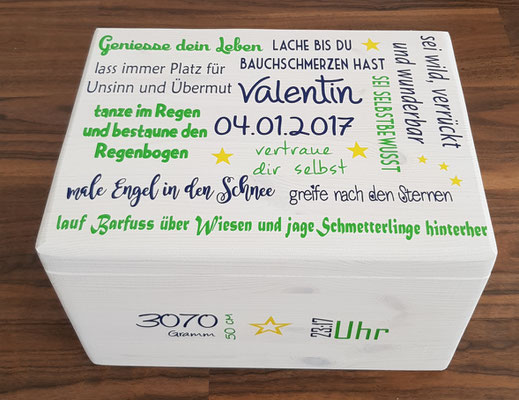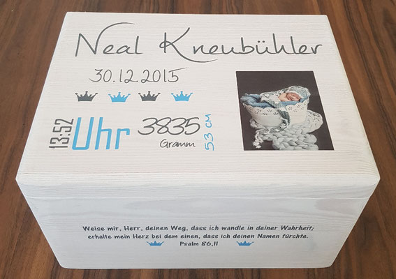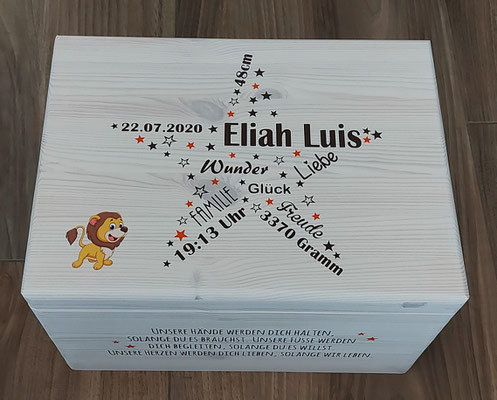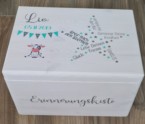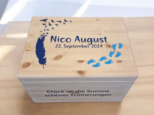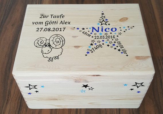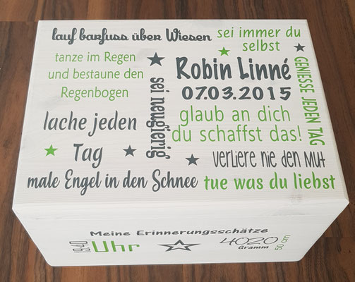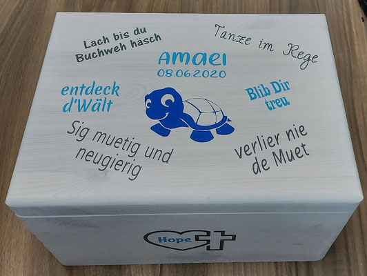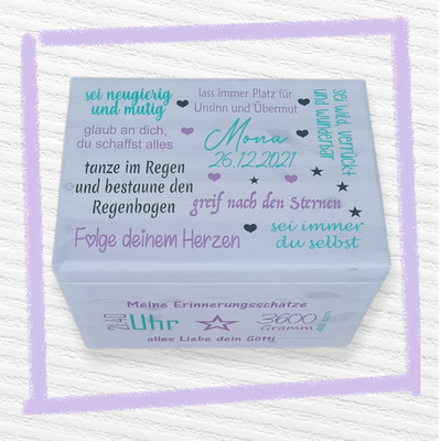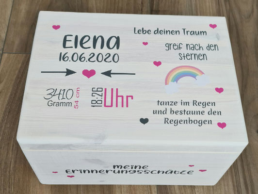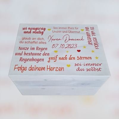 In dieser tollen Holzbox findet alles seinen Platz, was im Leben eures Kindes von Bedeutung ist. Sei es der erste Nuggi, Schuhe, die Spieluhr, das Lieblingsnuscheli, die GlĂŒckwunschkarten zur Geburt, Taufe oder Geburtstag.