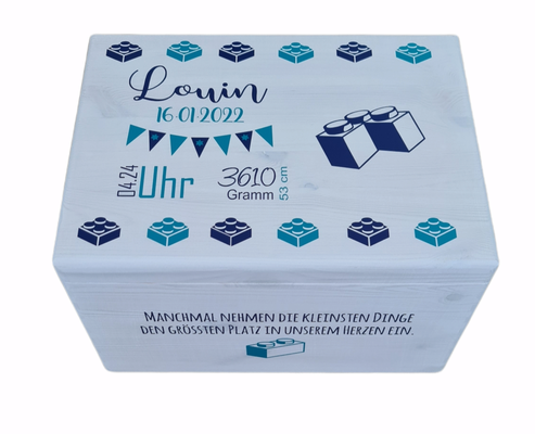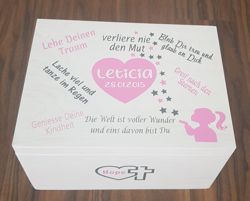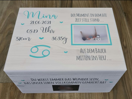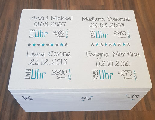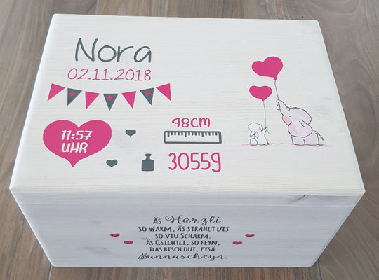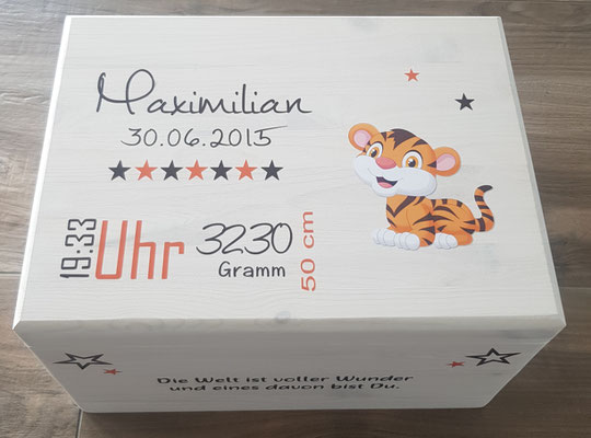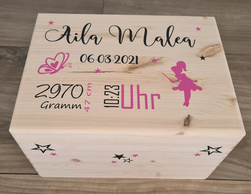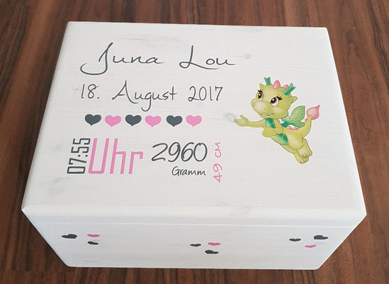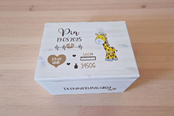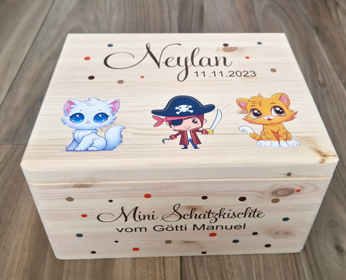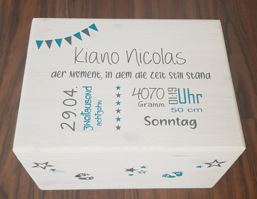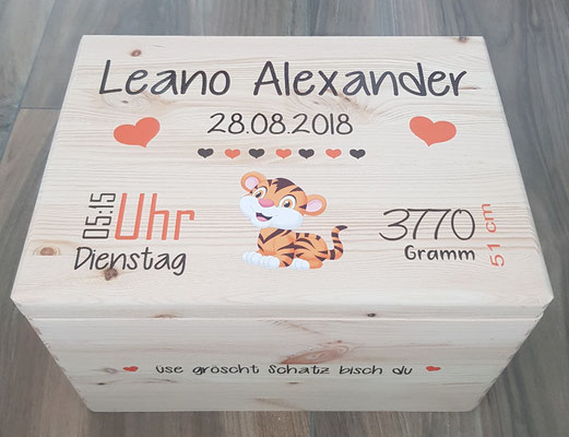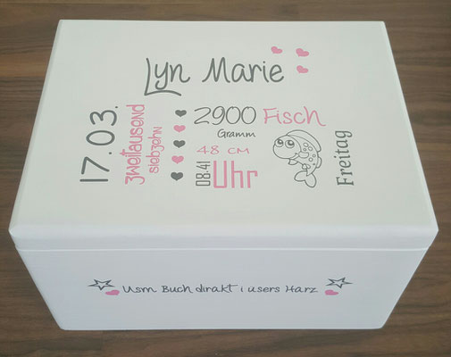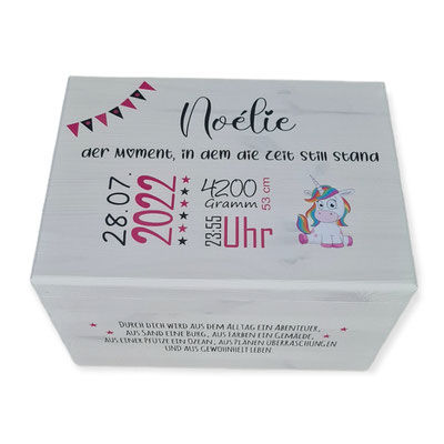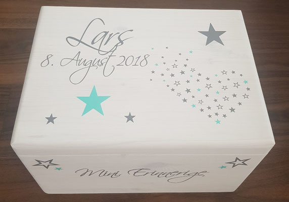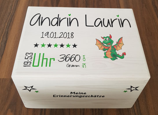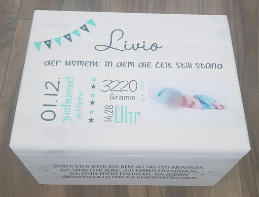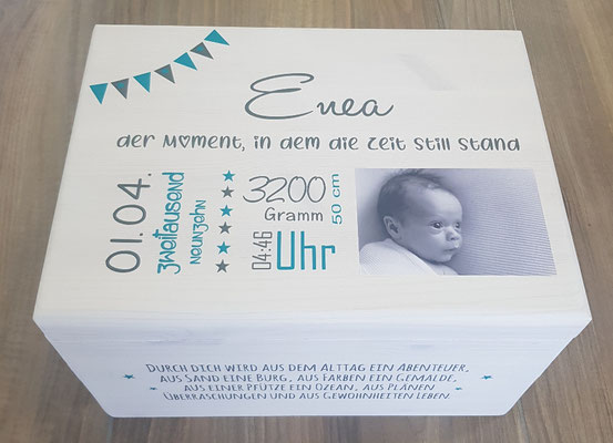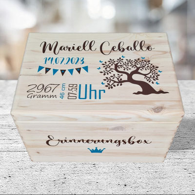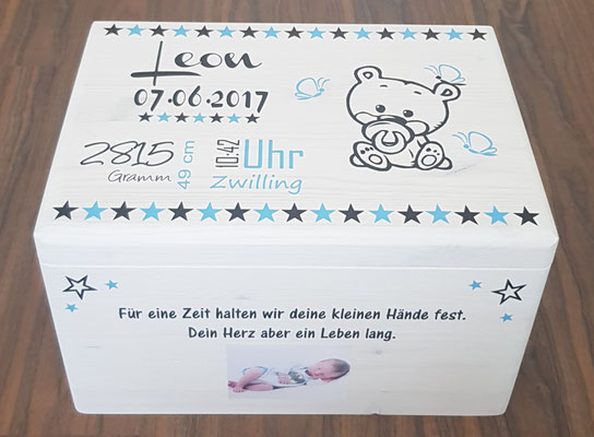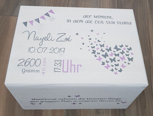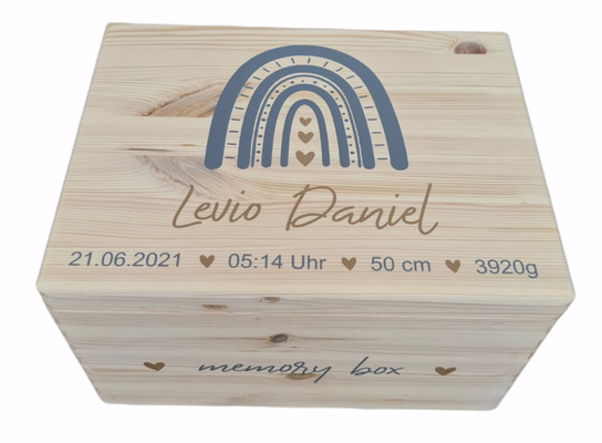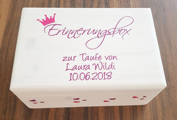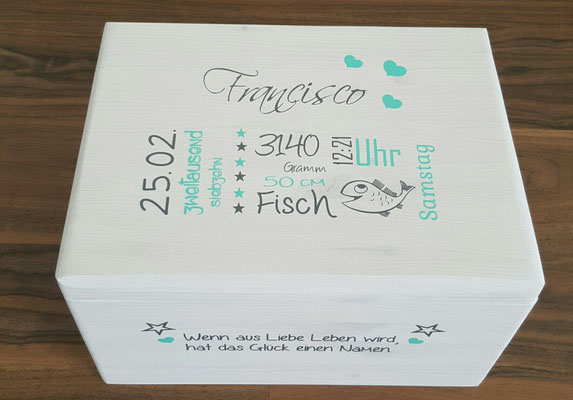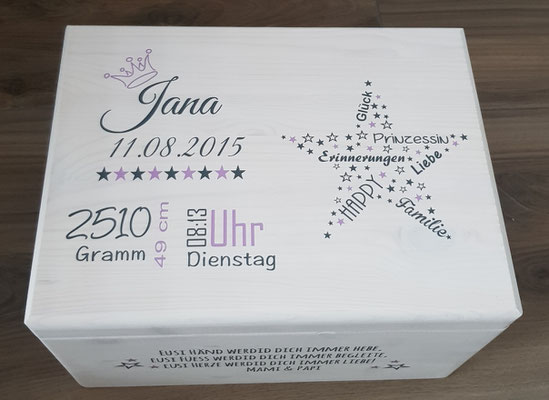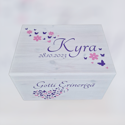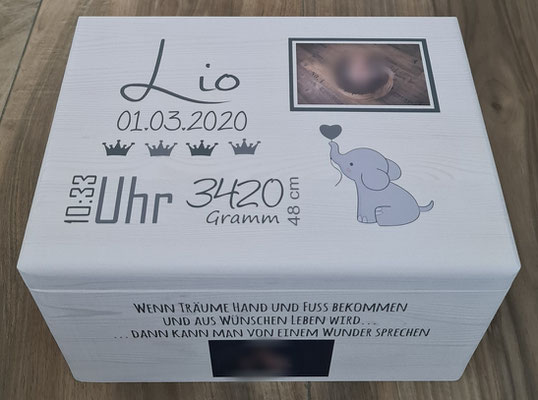 In dieser tollen Holzbox findet alles seinen Platz, was im Leben eures Kindes von Bedeutung ist. Sei es der erste Nuggi, Schuhe, die Spieluhr, das Lieblingsnuscheli, die GlĂŒckwunschkarten zur Geburt, Taufe oder Geburtstag.