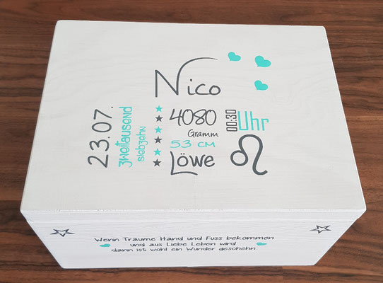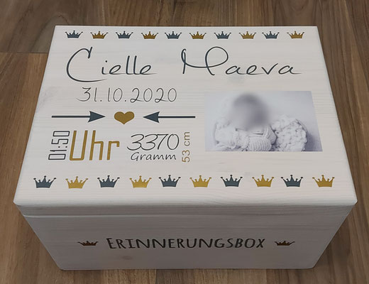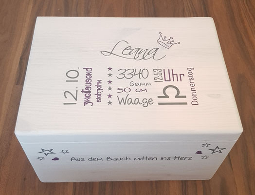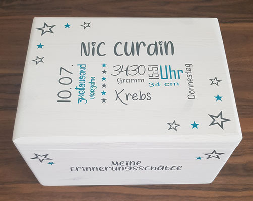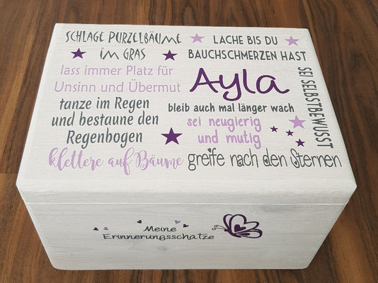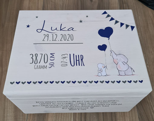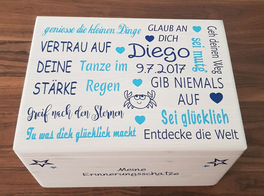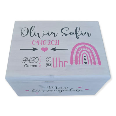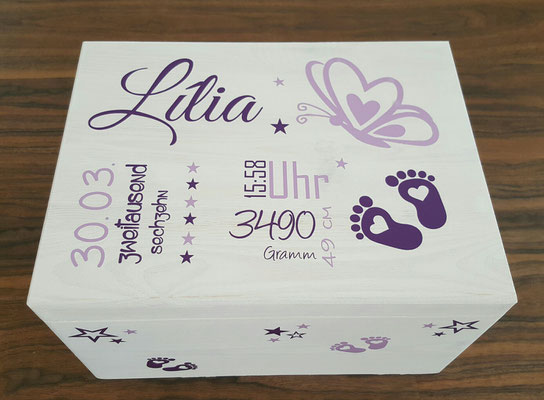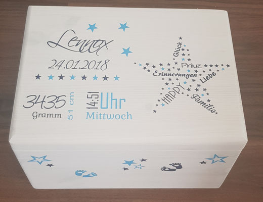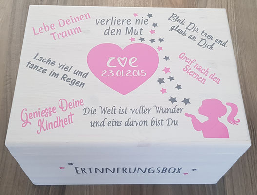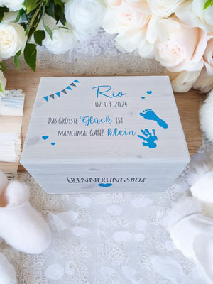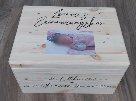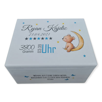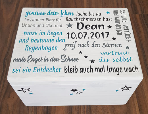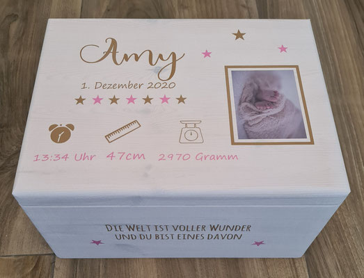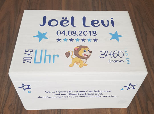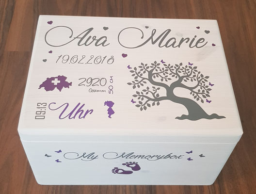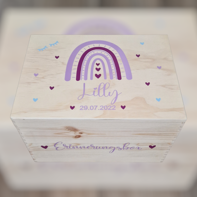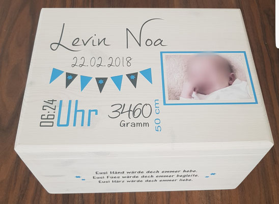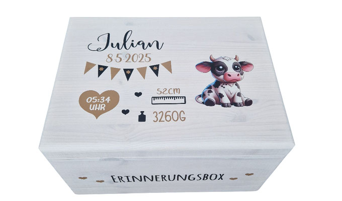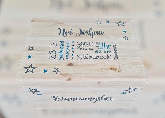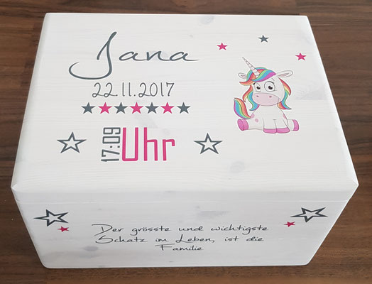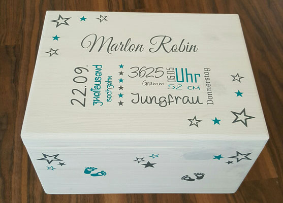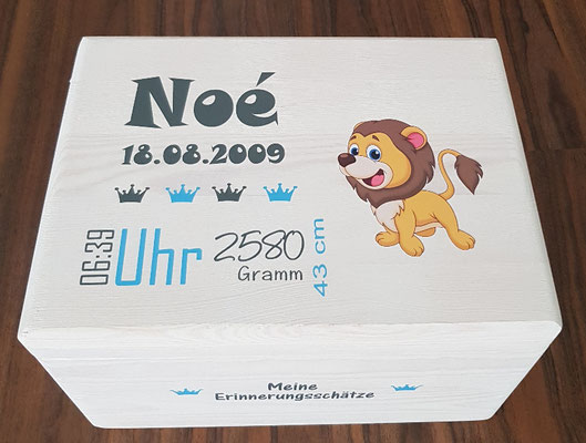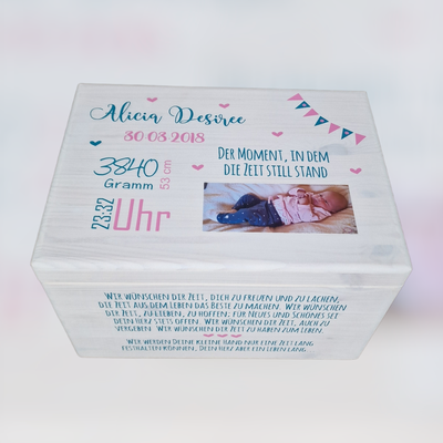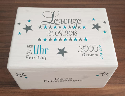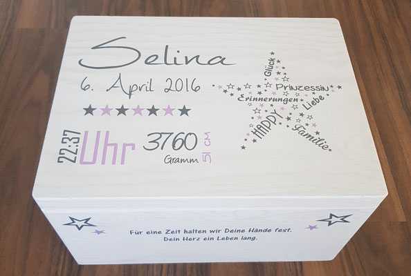 In dieser tollen Holzbox findet alles seinen Platz, was im Leben eures Kindes von Bedeutung ist. Sei es der erste Nuggi, Schuhe, die Spieluhr, das Lieblingsnuscheli, die GlĂŒckwunschkarten zur Geburt, Taufe oder Geburtstag.