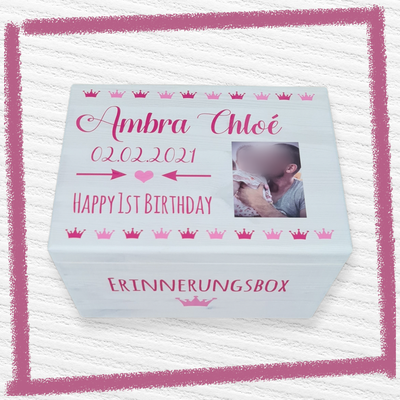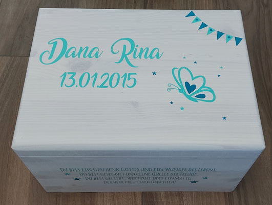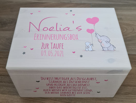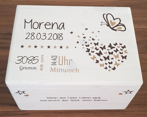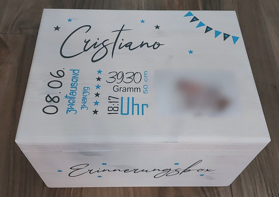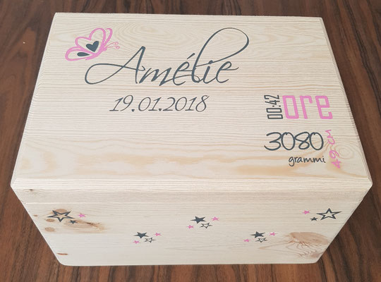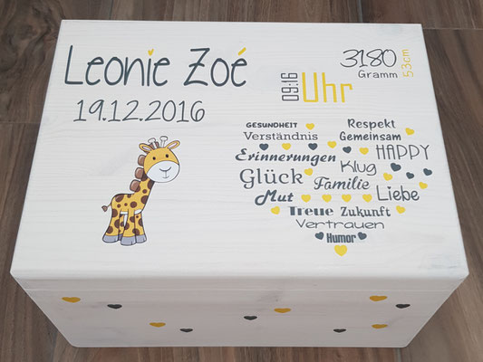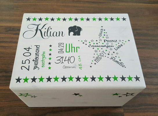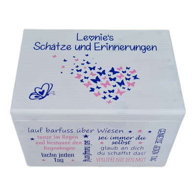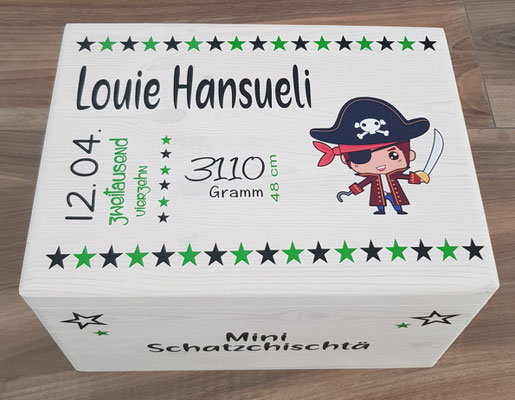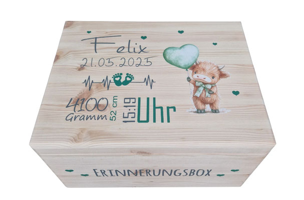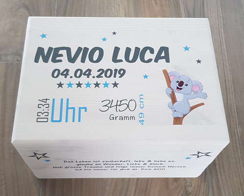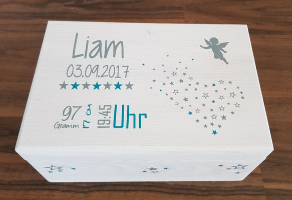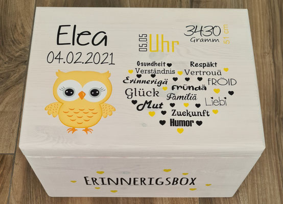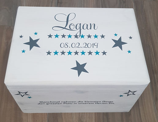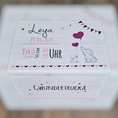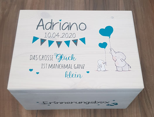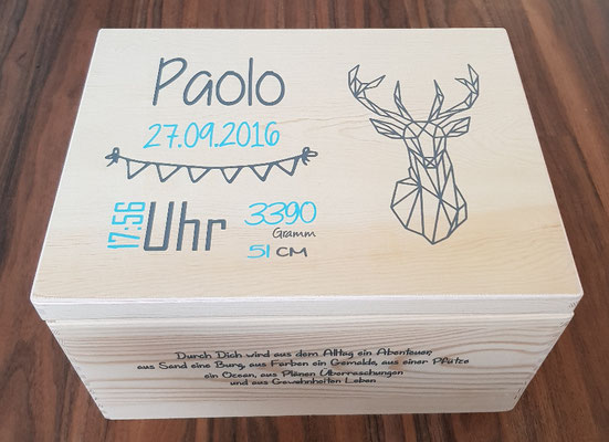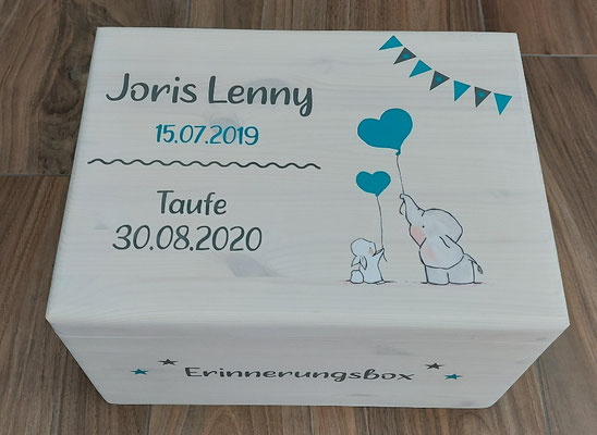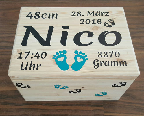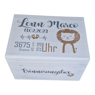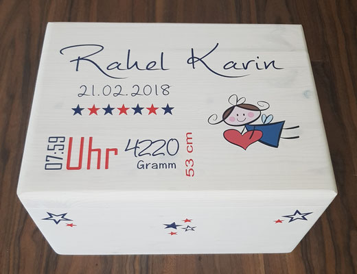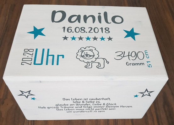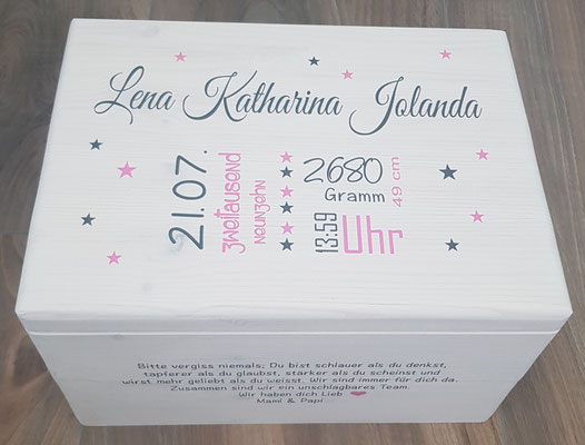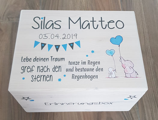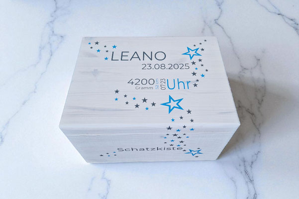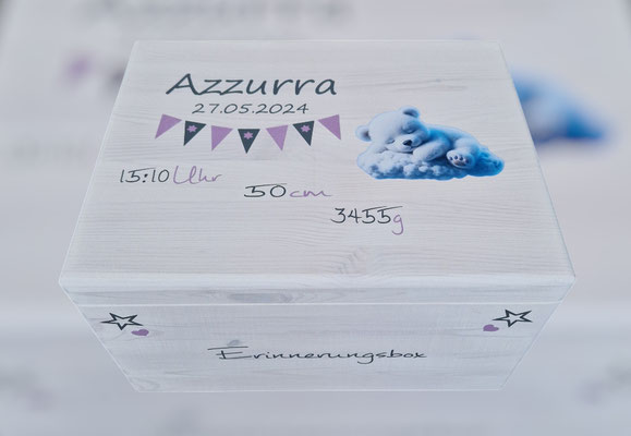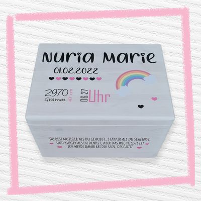 In dieser tollen Holzbox findet alles seinen Platz, was im Leben eures Kindes von Bedeutung ist. Sei es der erste Nuggi, Schuhe, die Spieluhr, das Lieblingsnuscheli, die GlĂŒckwunschkarten zur Geburt, Taufe oder Geburtstag.