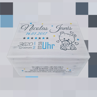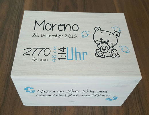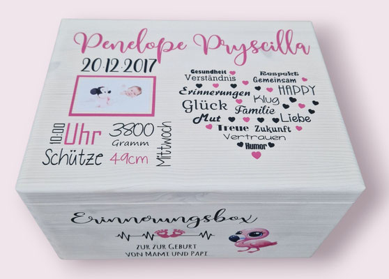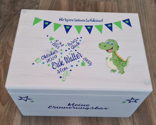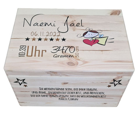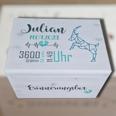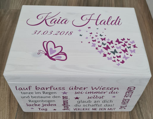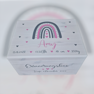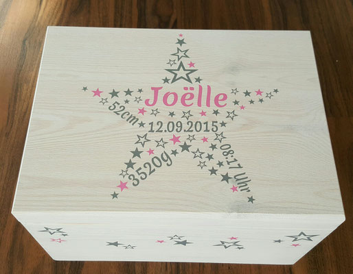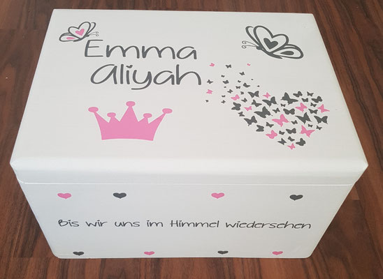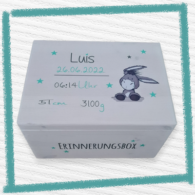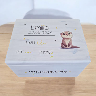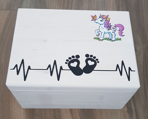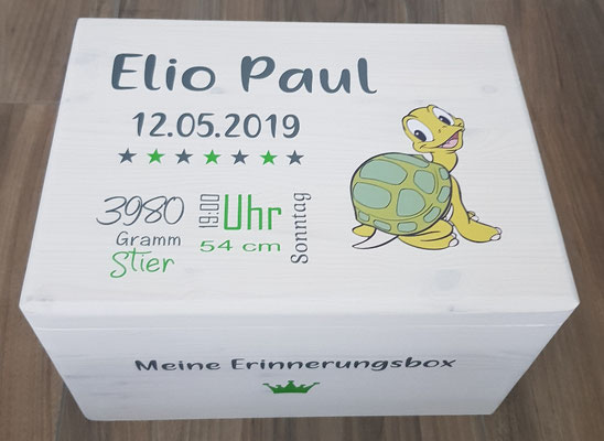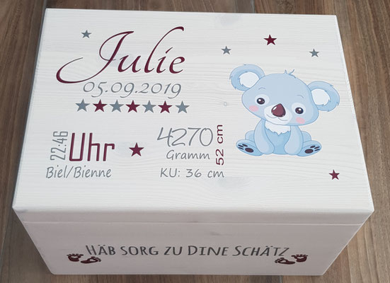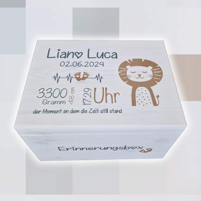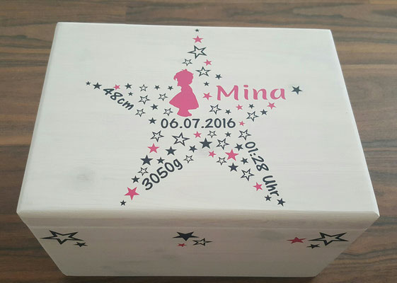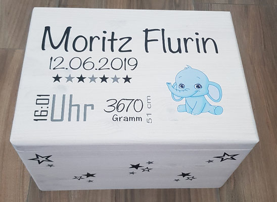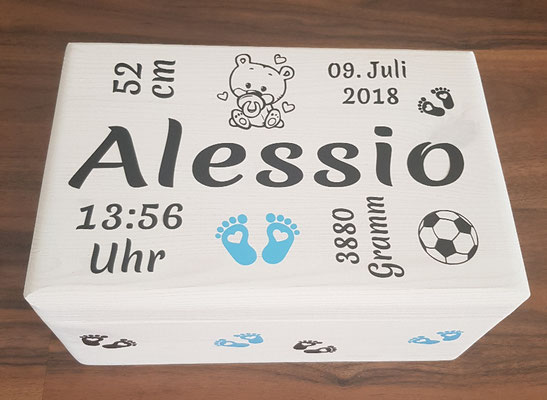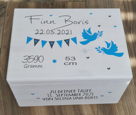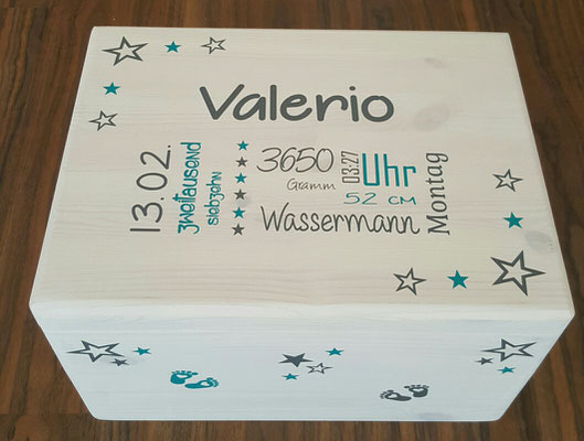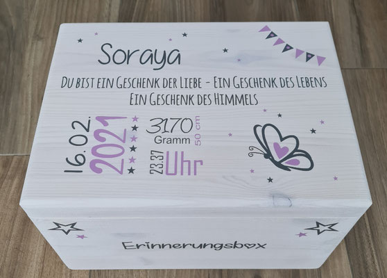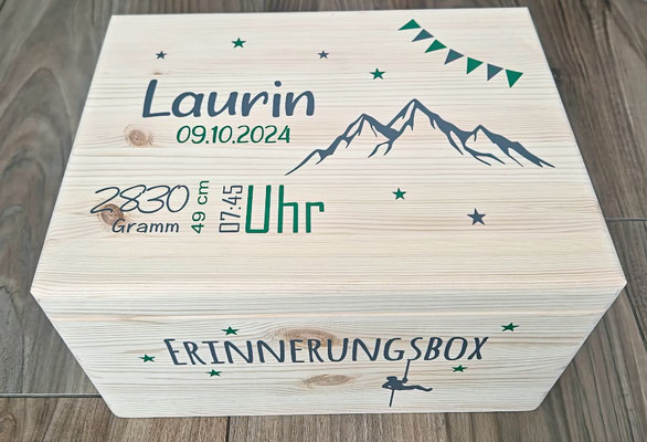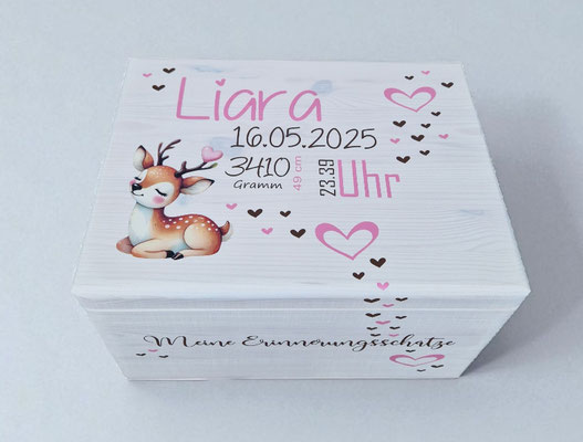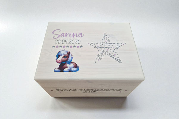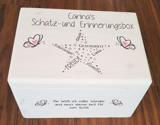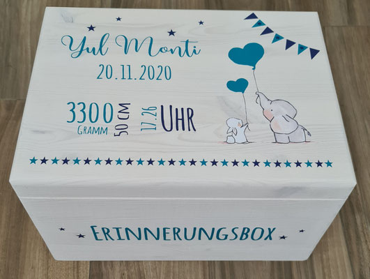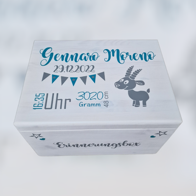 In dieser tollen Holzbox findet alles seinen Platz, was im Leben eures Kindes von Bedeutung ist. Sei es der erste Nuggi, Schuhe, die Spieluhr, das Lieblingsnuscheli, die GlĂŒckwunschkarten zur Geburt, Taufe oder Geburtstag.