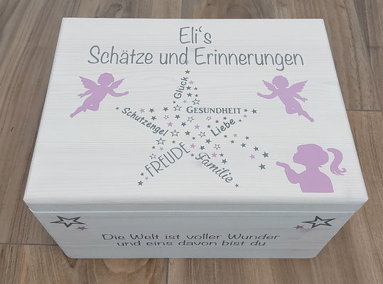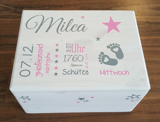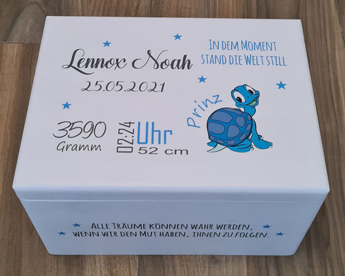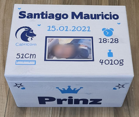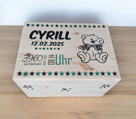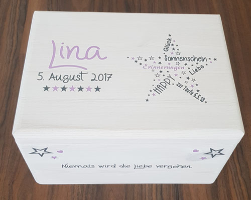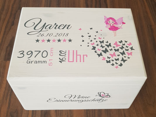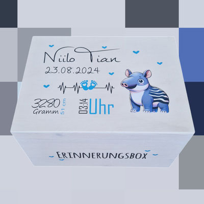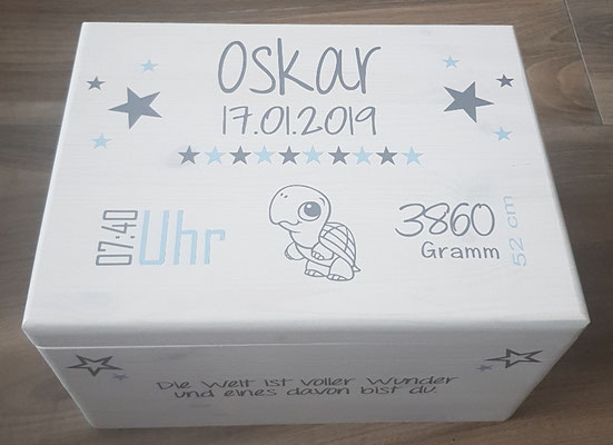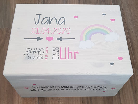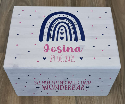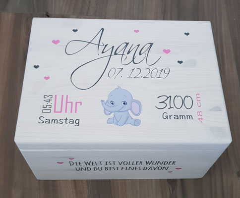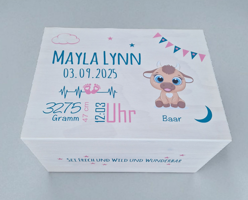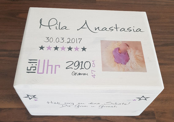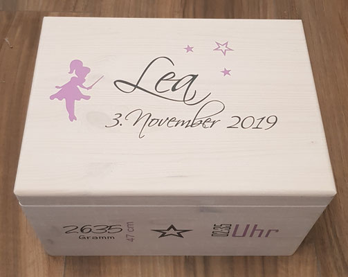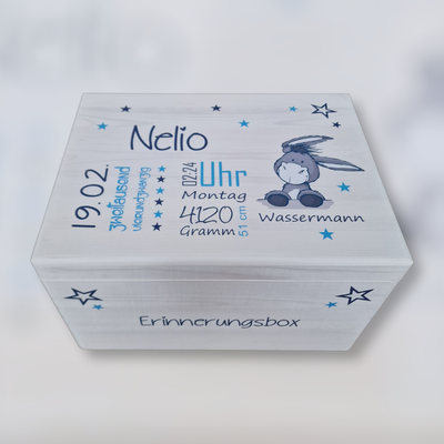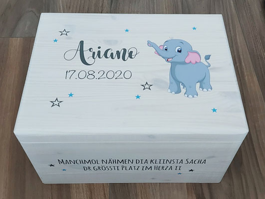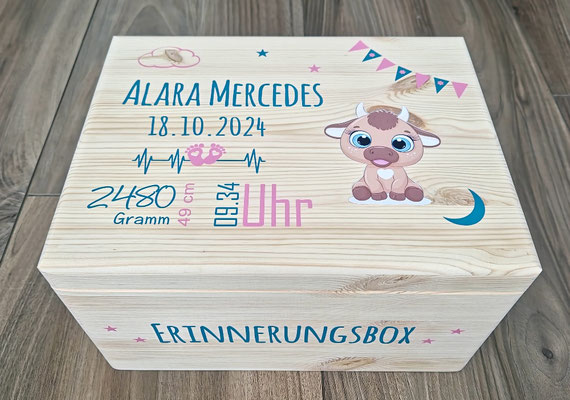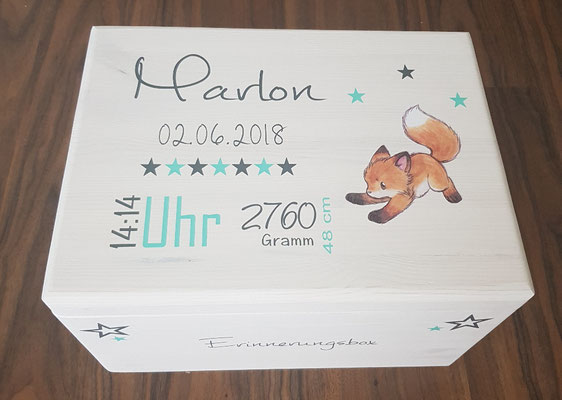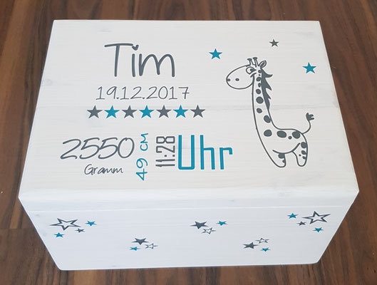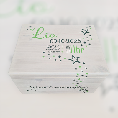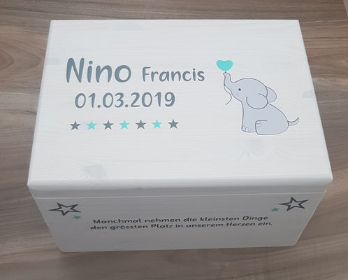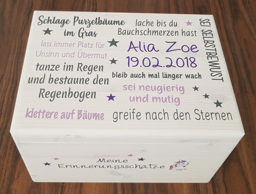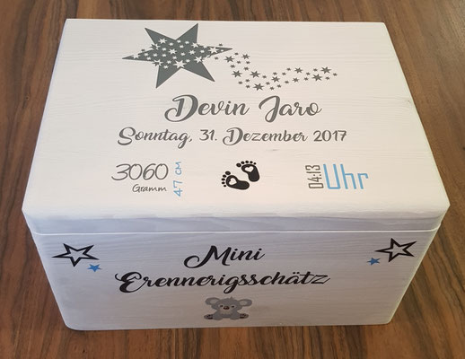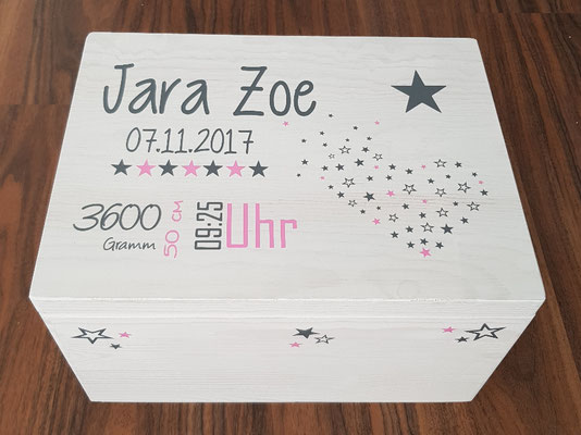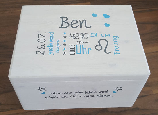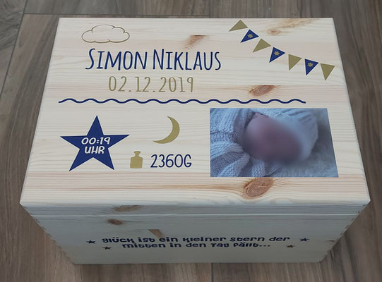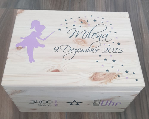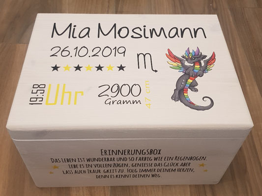 In dieser tollen Holzbox findet alles seinen Platz, was im Leben eures Kindes von Bedeutung ist. Sei es der erste Nuggi, Schuhe, die Spieluhr, das Lieblingsnuscheli, die GlĂŒckwunschkarten zur Geburt, Taufe oder Geburtstag.