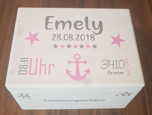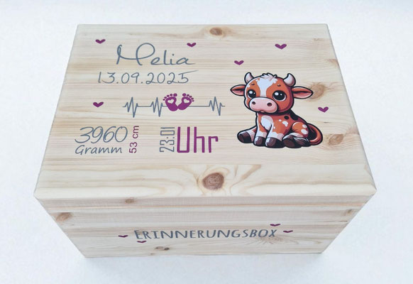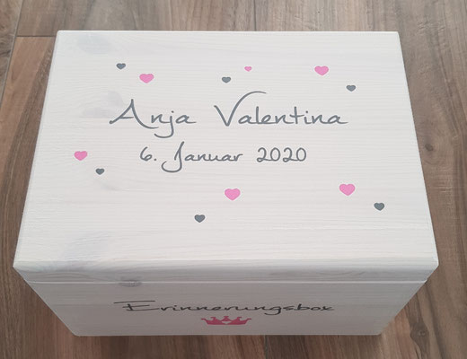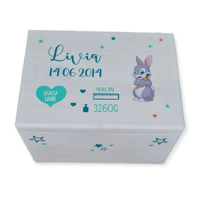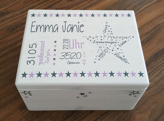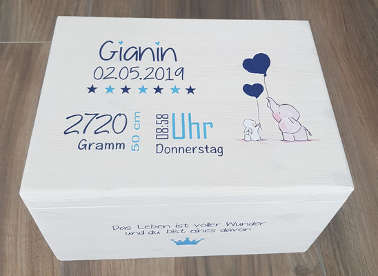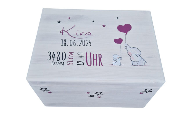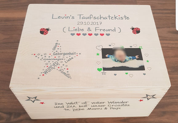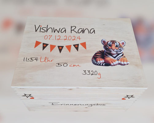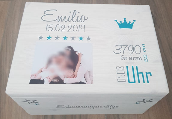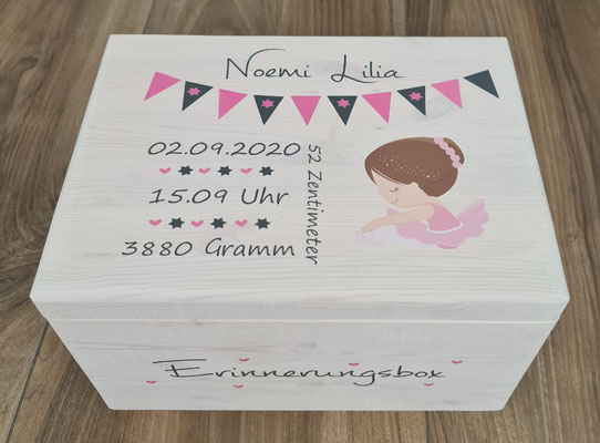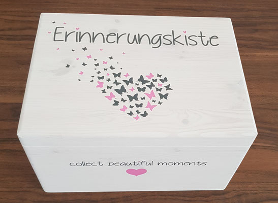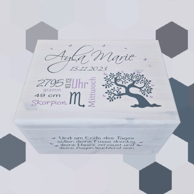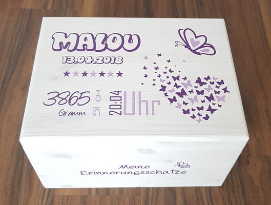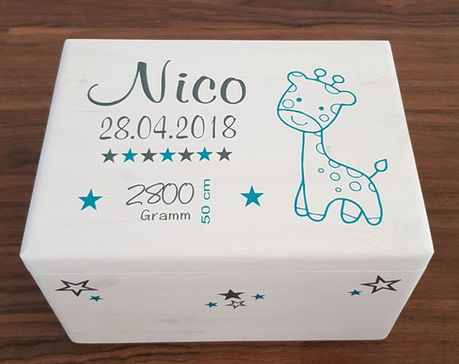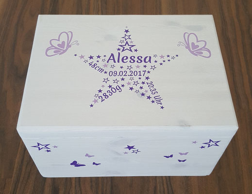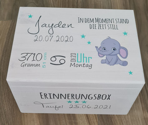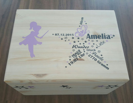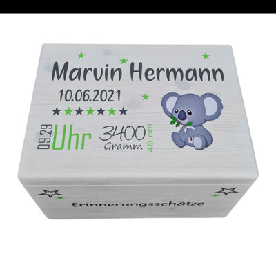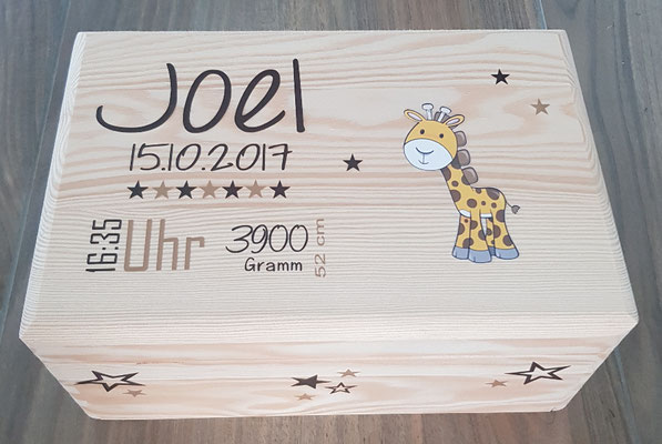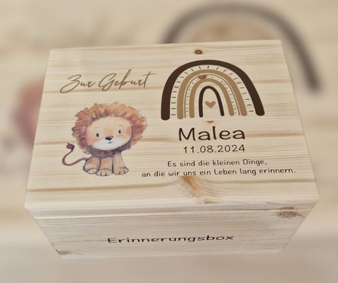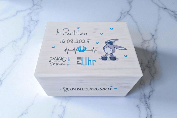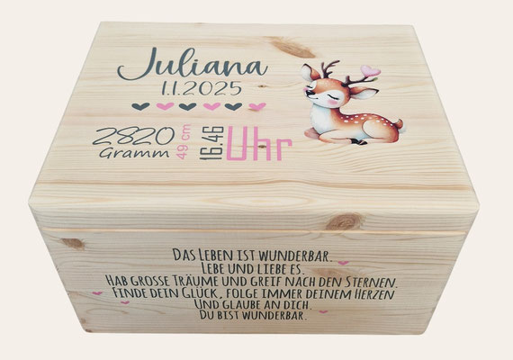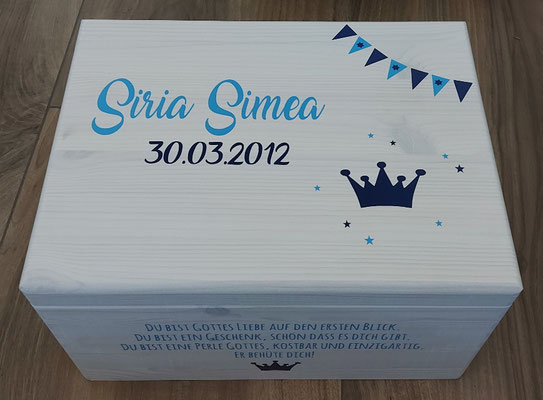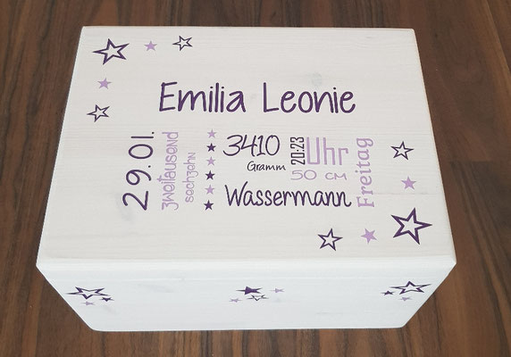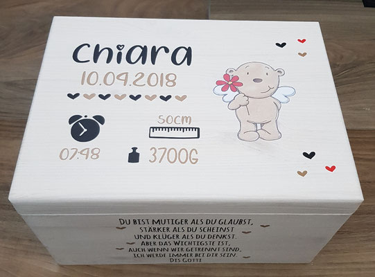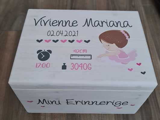 In dieser tollen Holzbox findet alles seinen Platz, was im Leben eures Kindes von Bedeutung ist. Sei es der erste Nuggi, Schuhe, die Spieluhr, das Lieblingsnuscheli, die GlĂŒckwunschkarten zur Geburt, Taufe oder Geburtstag.