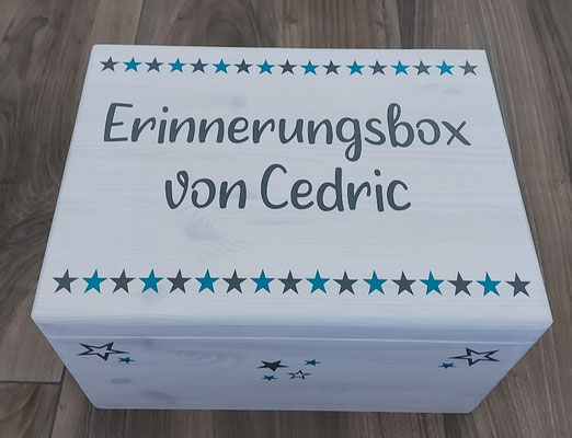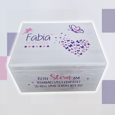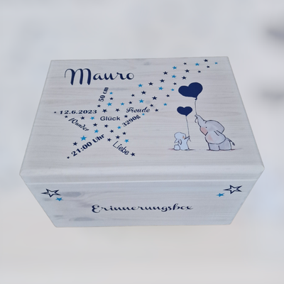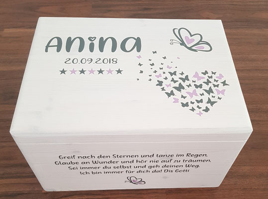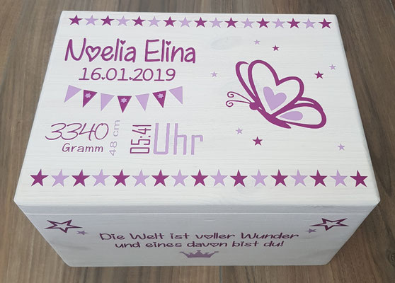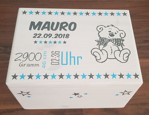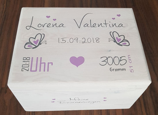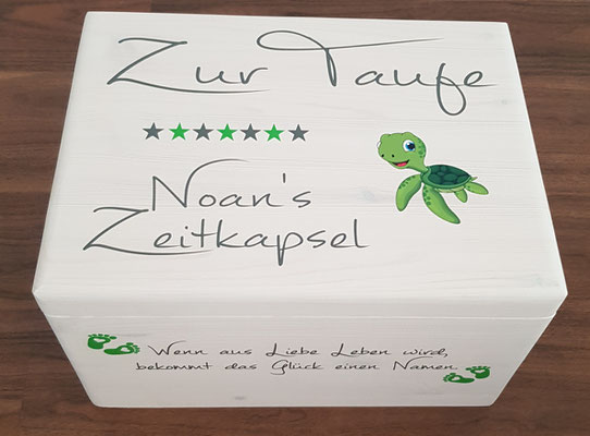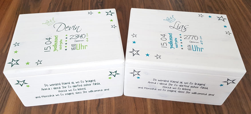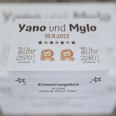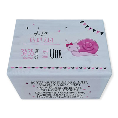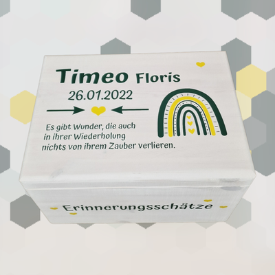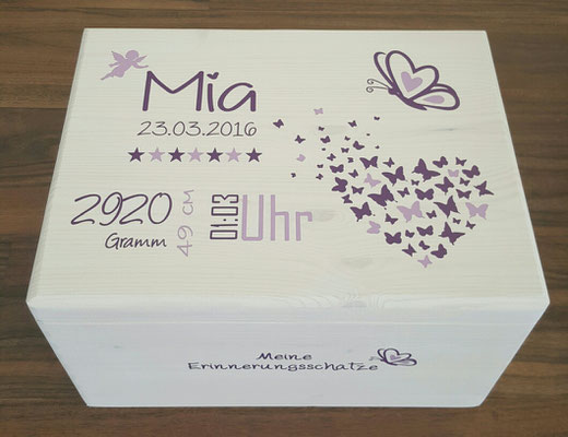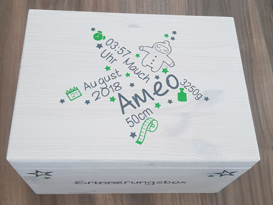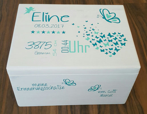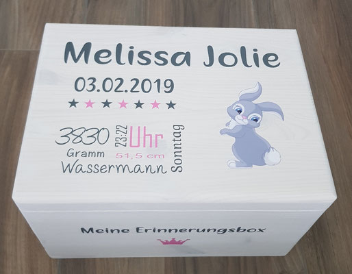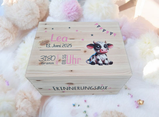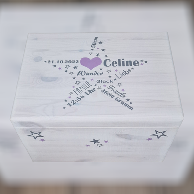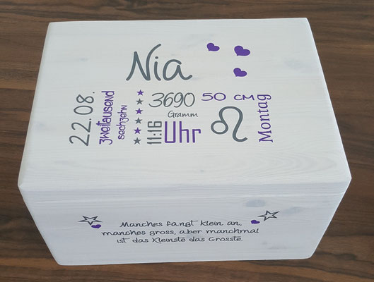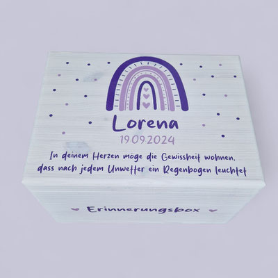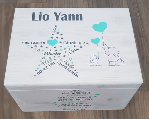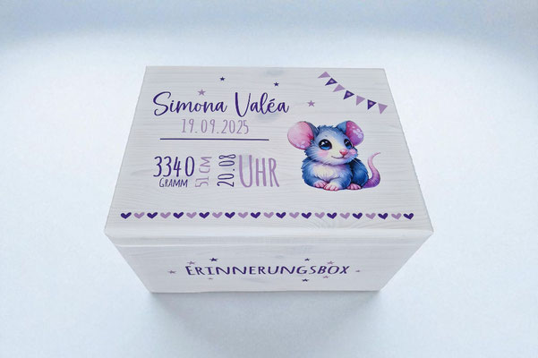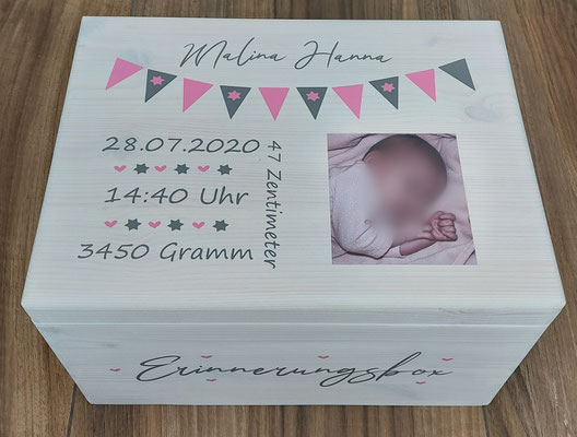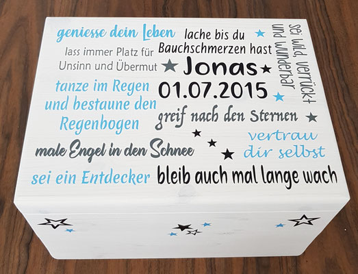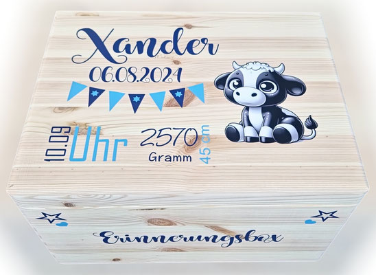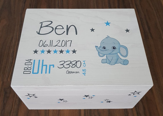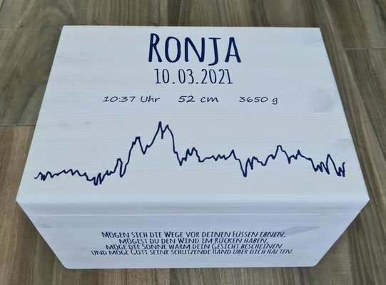 In dieser tollen Holzbox findet alles seinen Platz, was im Leben eures Kindes von Bedeutung ist. Sei es der erste Nuggi, Schuhe, die Spieluhr, das Lieblingsnuscheli, die GlĂŒckwunschkarten zur Geburt, Taufe oder Geburtstag.