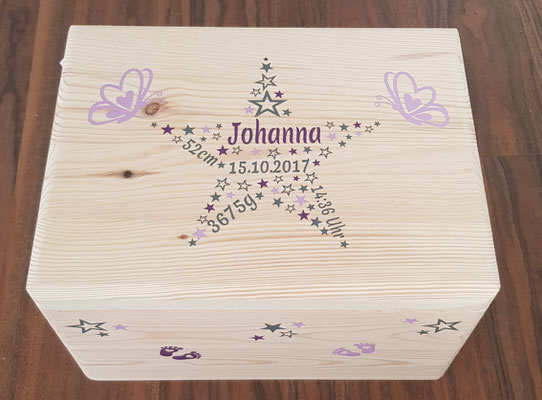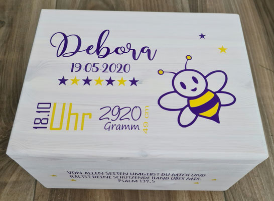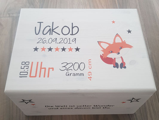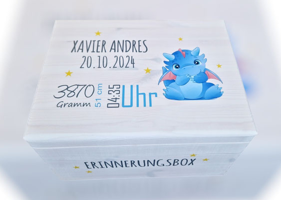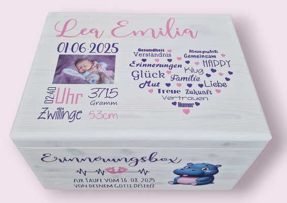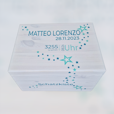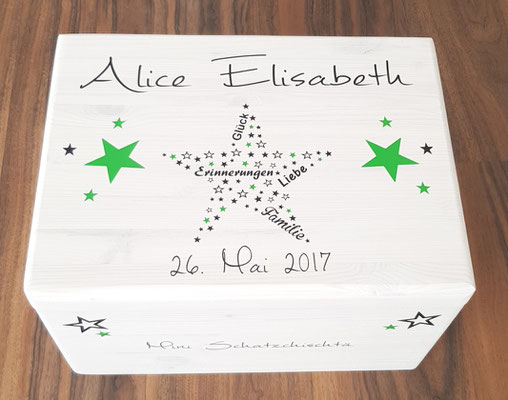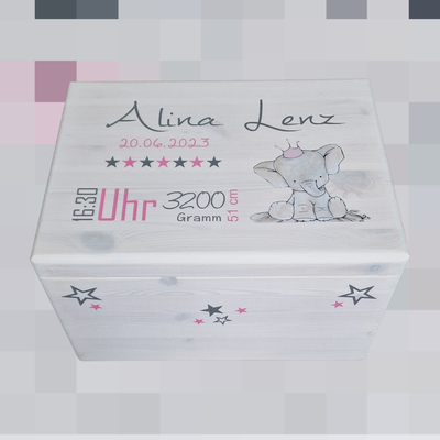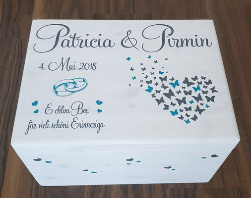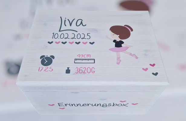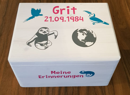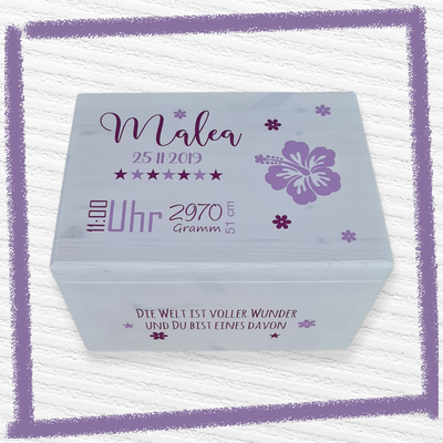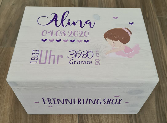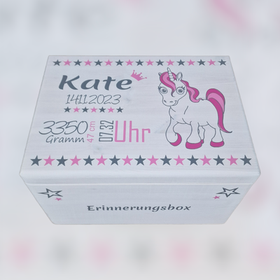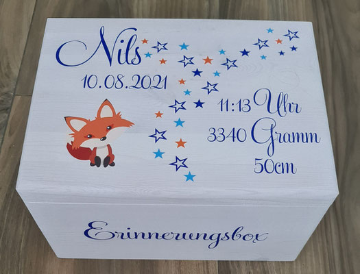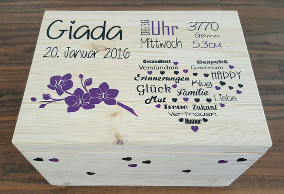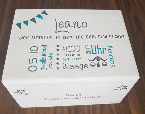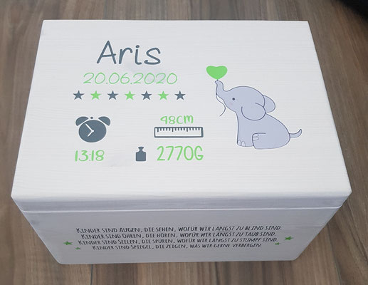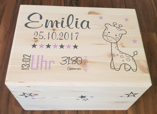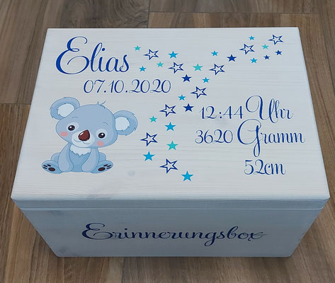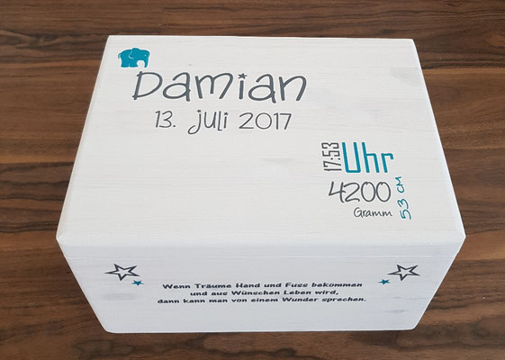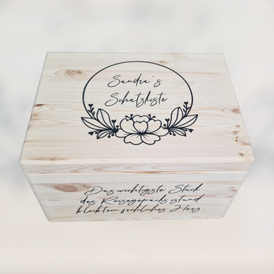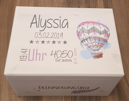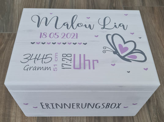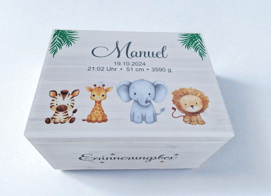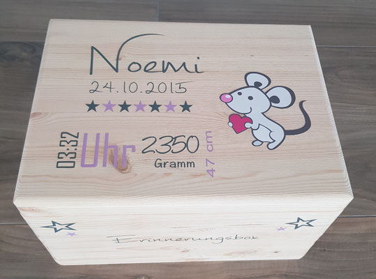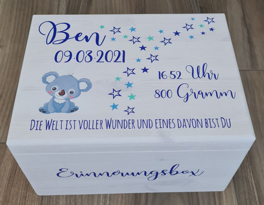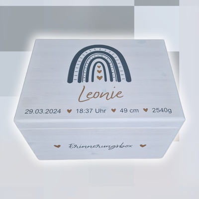 In dieser tollen Holzbox findet alles seinen Platz, was im Leben eures Kindes von Bedeutung ist. Sei es der erste Nuggi, Schuhe, die Spieluhr, das Lieblingsnuscheli, die GlĂŒckwunschkarten zur Geburt, Taufe oder Geburtstag.