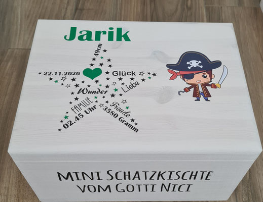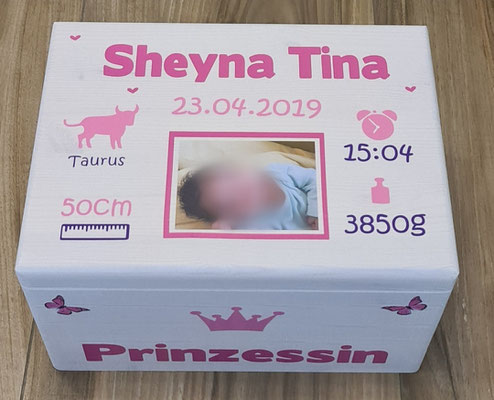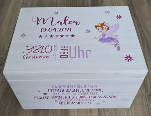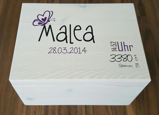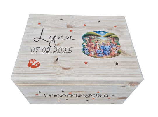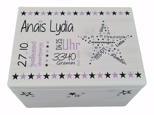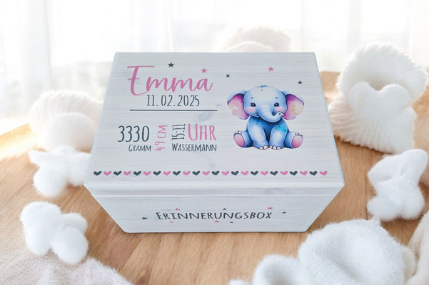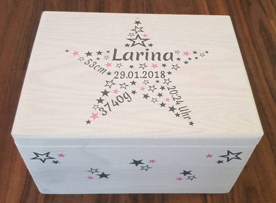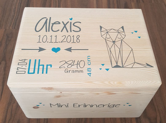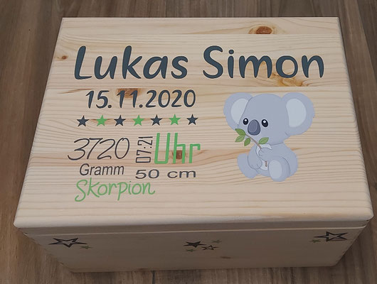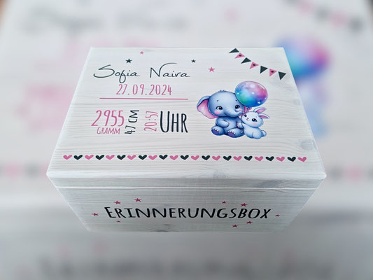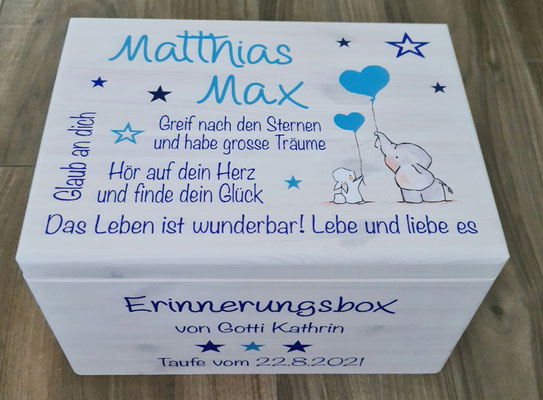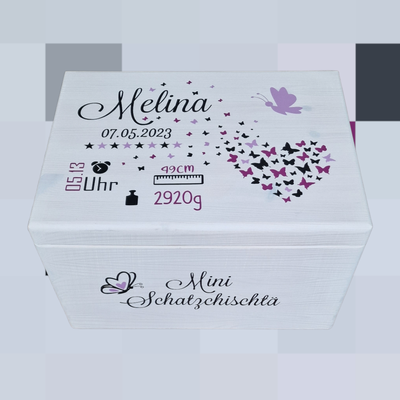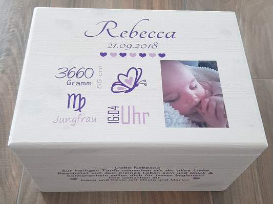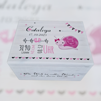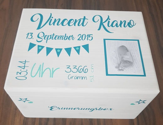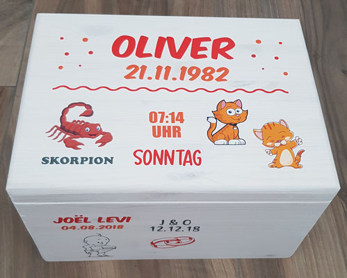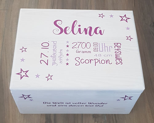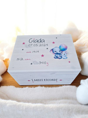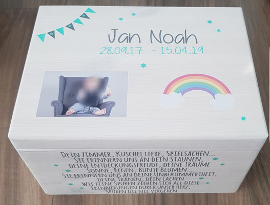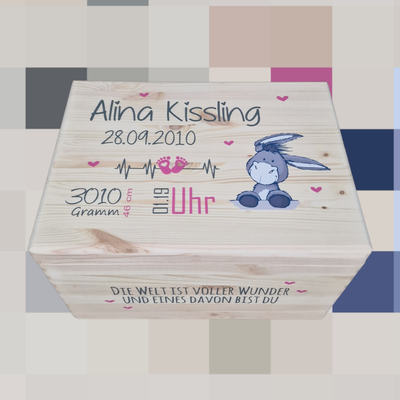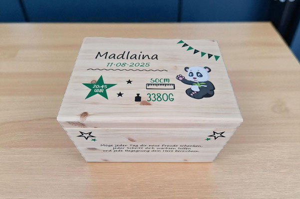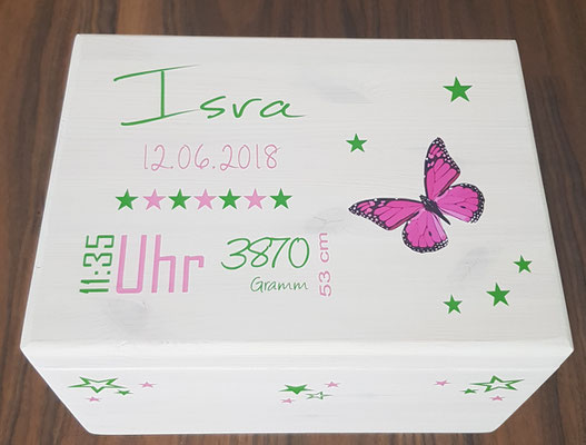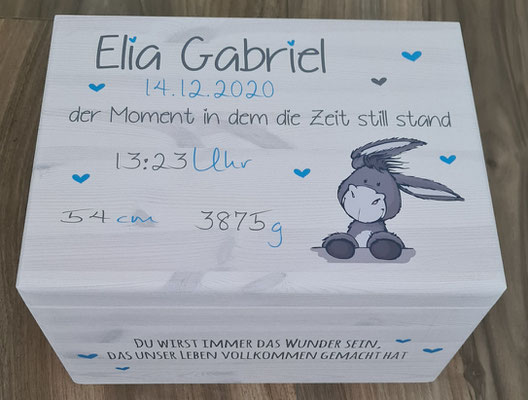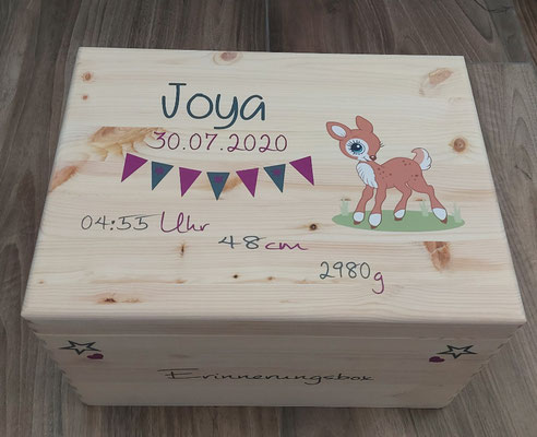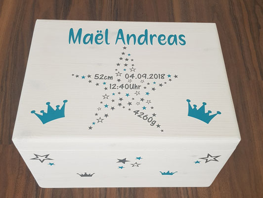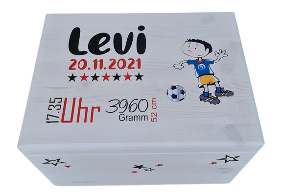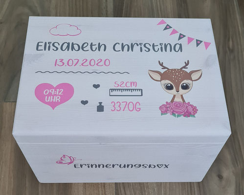 In dieser tollen Holzbox findet alles seinen Platz, was im Leben eures Kindes von Bedeutung ist. Sei es der erste Nuggi, Schuhe, die Spieluhr, das Lieblingsnuscheli, die GlĂŒckwunschkarten zur Geburt, Taufe oder Geburtstag.