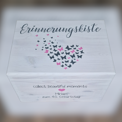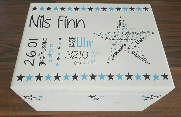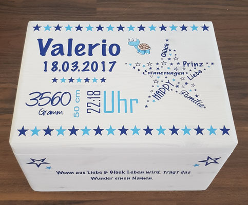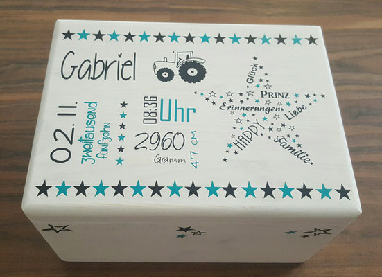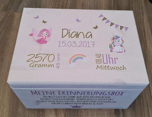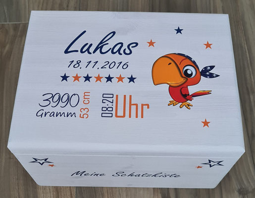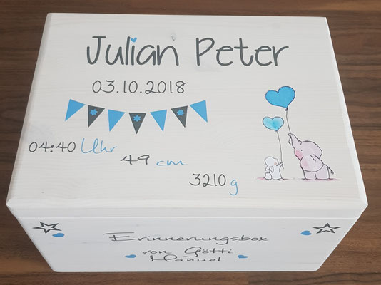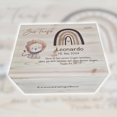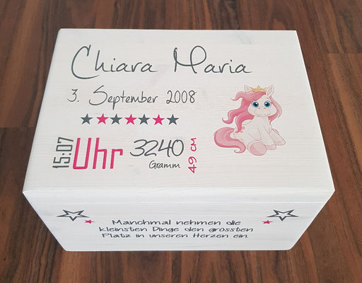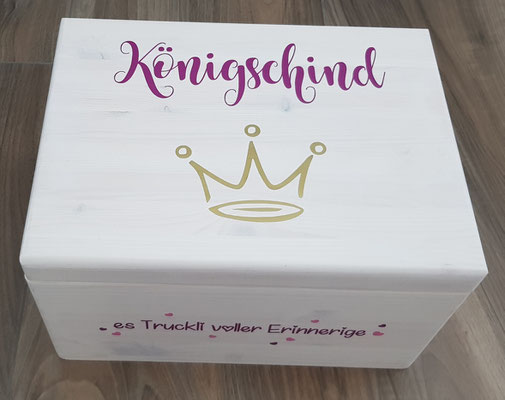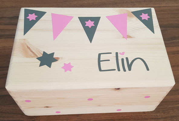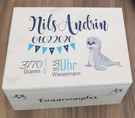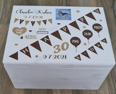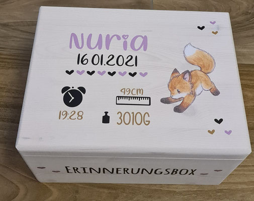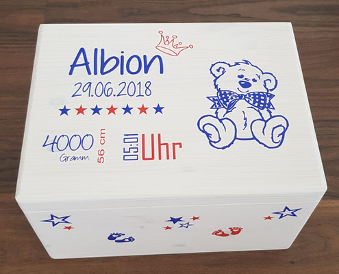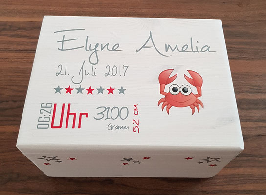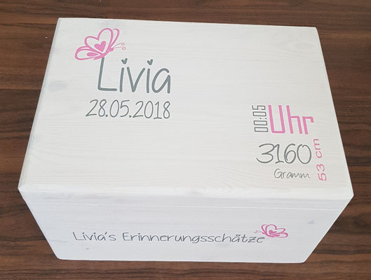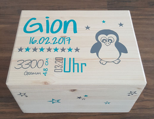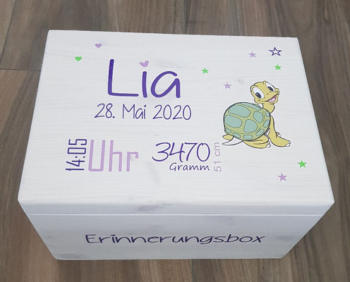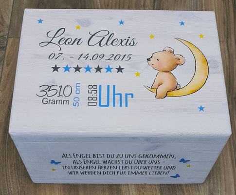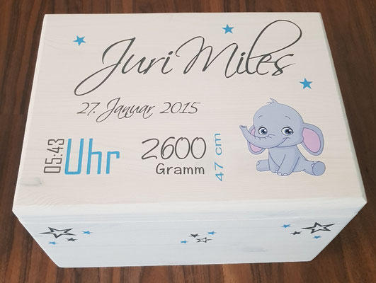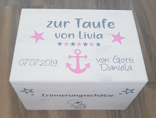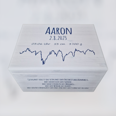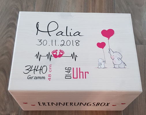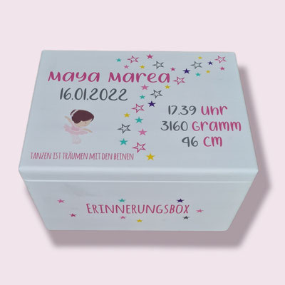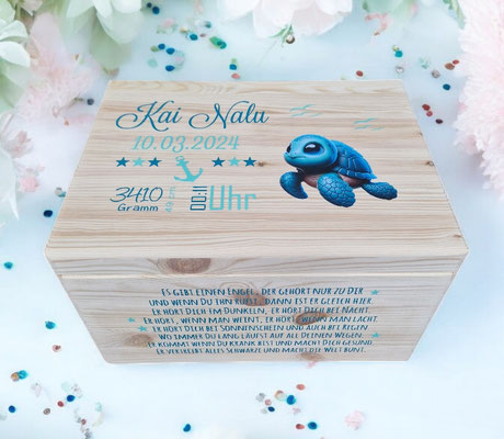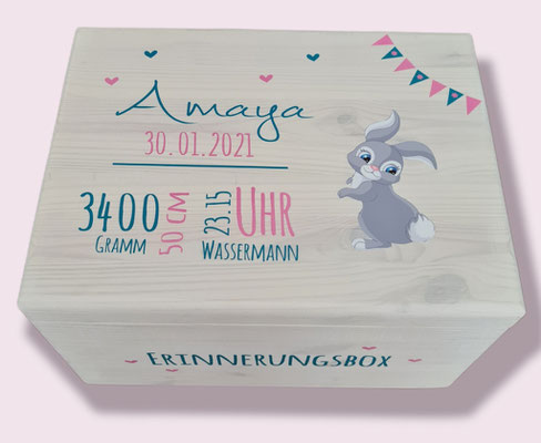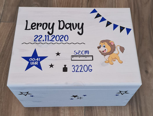 In dieser tollen Holzbox findet alles seinen Platz, was im Leben eures Kindes von Bedeutung ist. Sei es der erste Nuggi, Schuhe, die Spieluhr, das Lieblingsnuscheli, die GlĂŒckwunschkarten zur Geburt, Taufe oder Geburtstag.