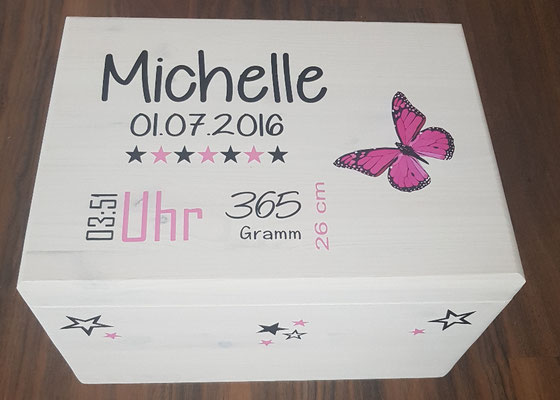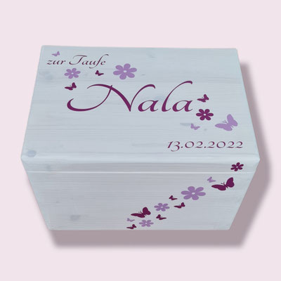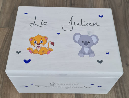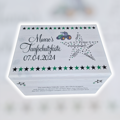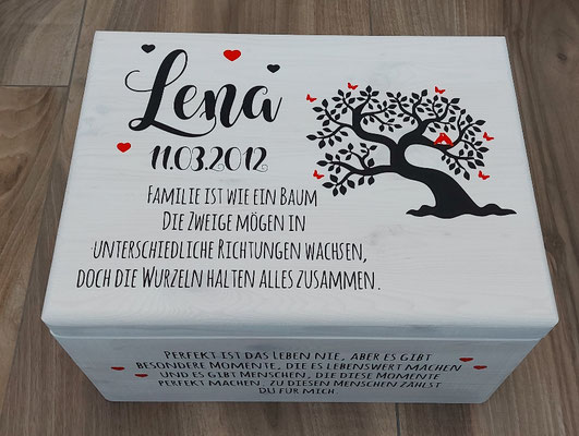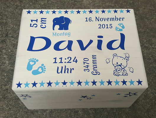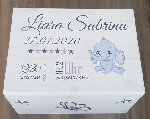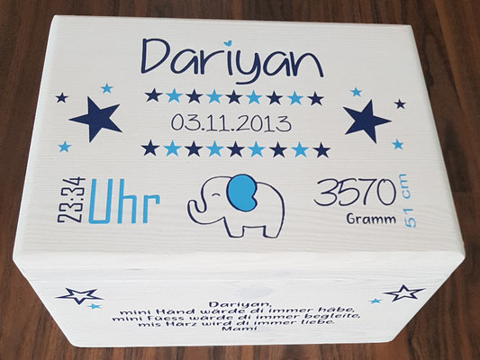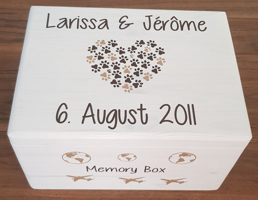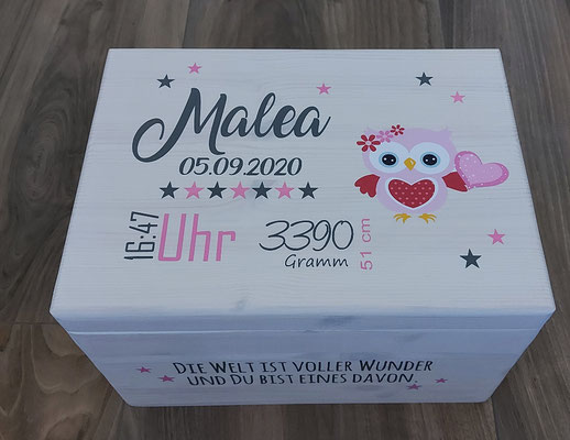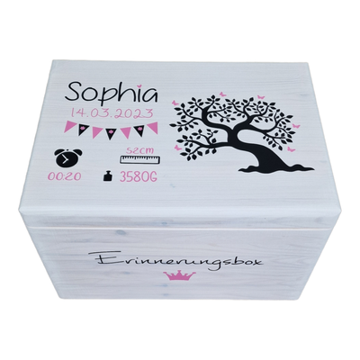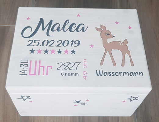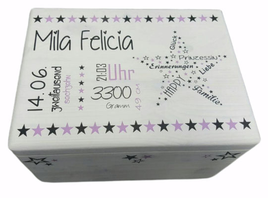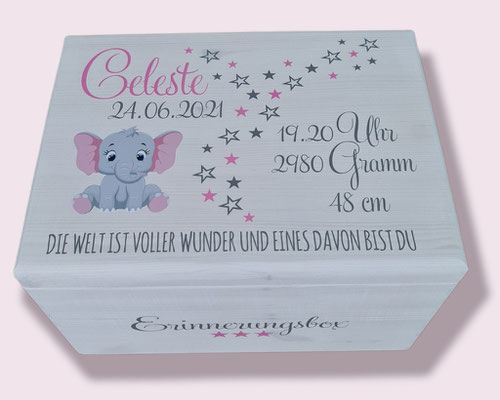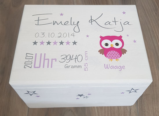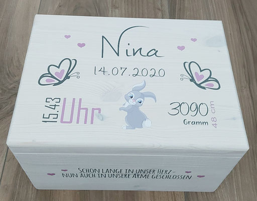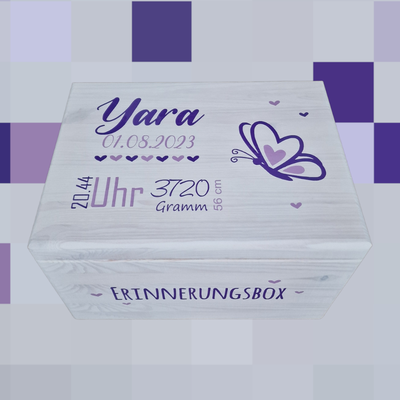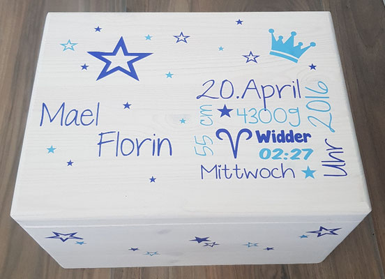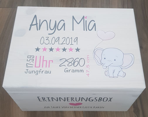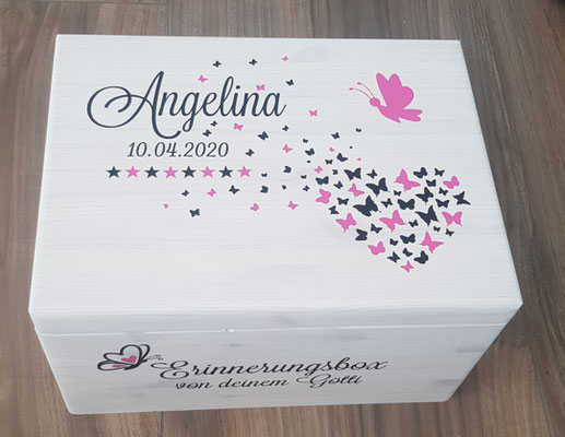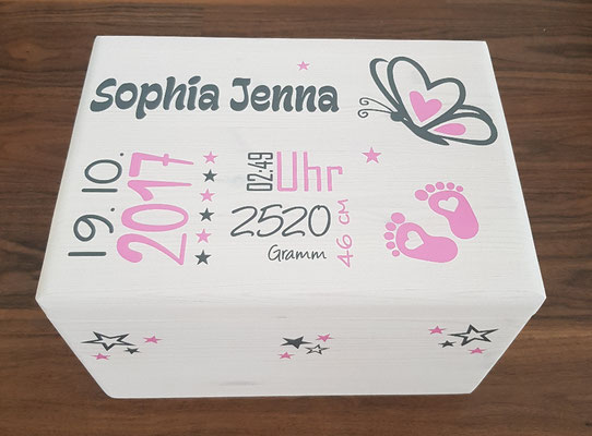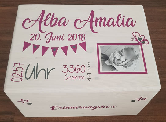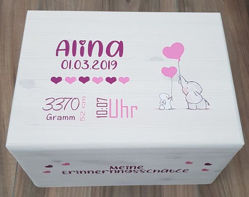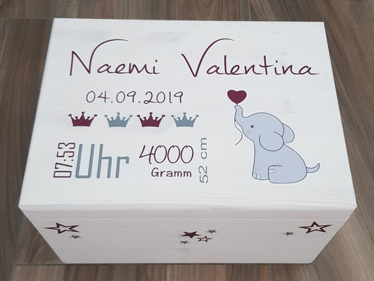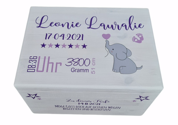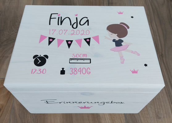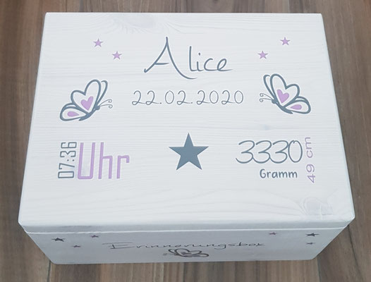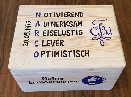 In dieser tollen Holzbox findet alles seinen Platz, was im Leben eures Kindes von Bedeutung ist. Sei es der erste Nuggi, Schuhe, die Spieluhr, das Lieblingsnuscheli, die GlĂŒckwunschkarten zur Geburt, Taufe oder Geburtstag.